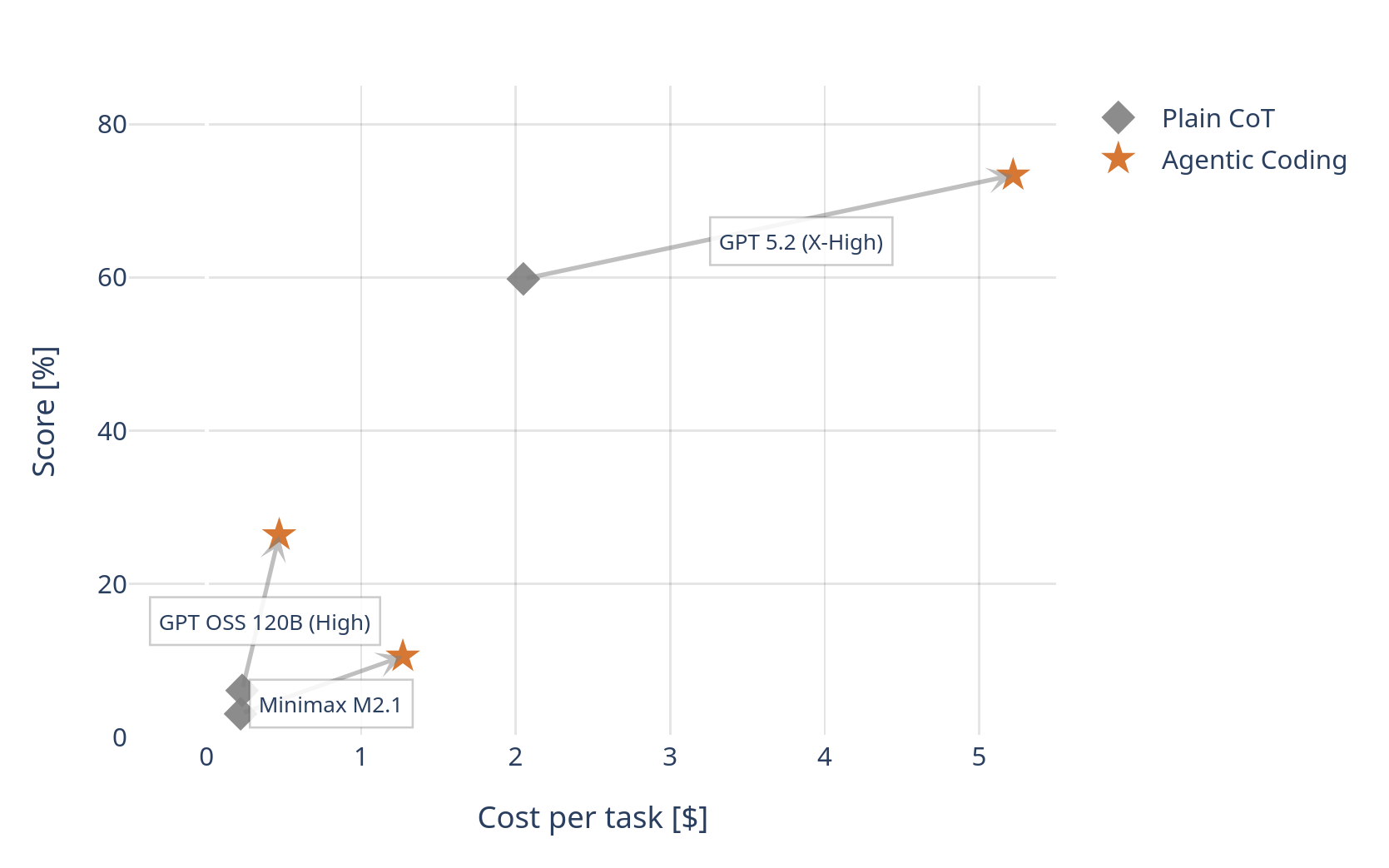 At this point, we noticed something unexpected: simply placing the model into an agentic coding regime produced large and consistent score improvements on the ARC AGI public eval. We are talking about > 4x improvement relative to plain COT. We couldn’t believe the scores we were getting from a medium sized OSS model!